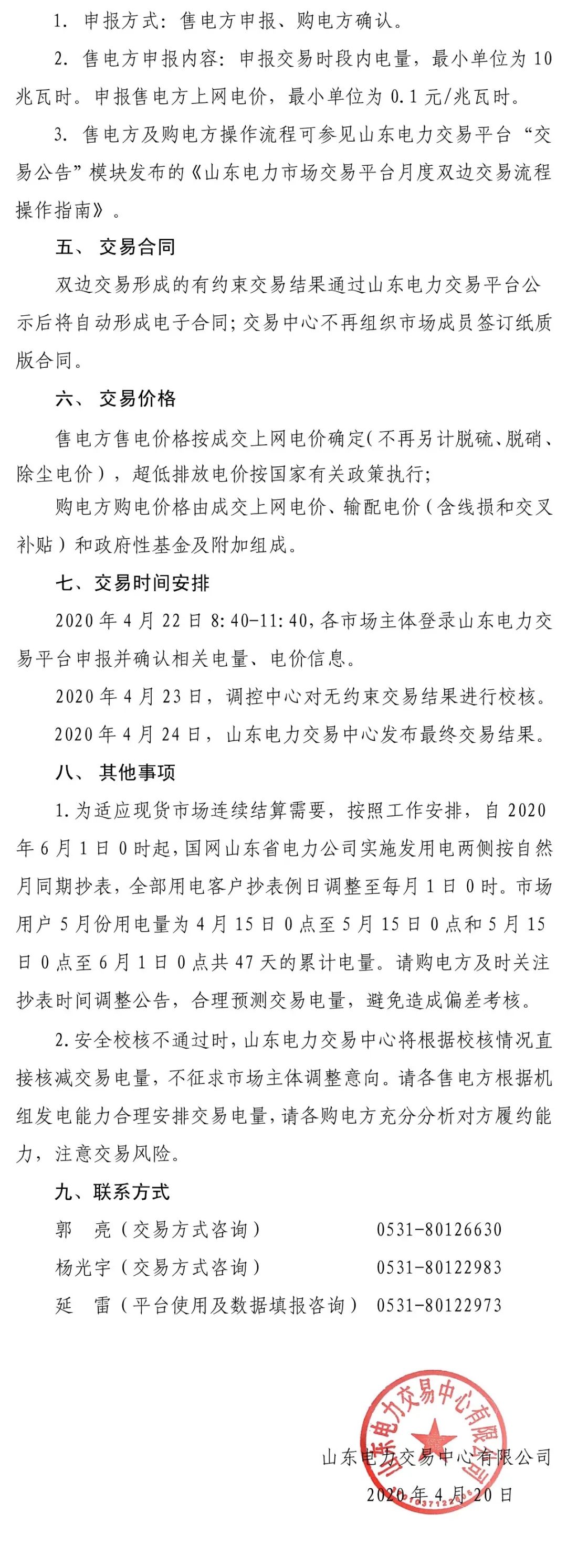 根據(jù)《關(guān)于做好2020年全省電力市場交易有關(guān)工作的通知》(魯發(fā)改能源〔2019〕1164號)、《關(guān)于修訂山東省電力中長期交易規(guī)則有關(guān)條款的通知》(魯監(jiān)能市場〔2019〕131號)等文件要求,山東電力交易中心有限公司定于近期開展山東省2020年5月份電力直接交易(雙邊協(xié)商),交易公告如下:
